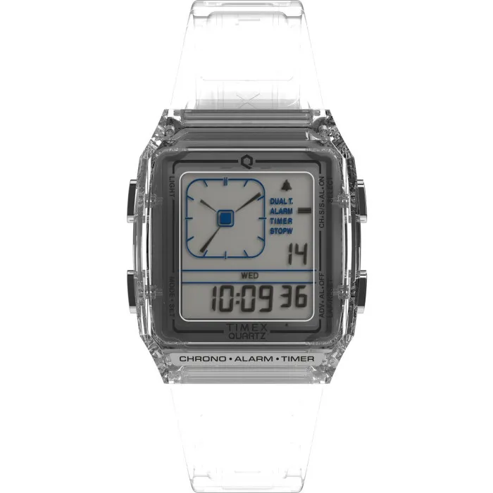 The Timex® Digital 'Lca' Unisex's Watch TW2W45200 is designed not just for telling time but as a versatile accessory that complements an active lifestyle. This model, embodying the essence of Timex's commitment to durability and functionality, showcases a sporty design crafted for anyone seeking functionality without compromising style. With its transparent resin case measuring 35mm in diameter and a thickness of 9mm, the watch promises a lightweight yet robust feel on the wrist. The striking LCD dial is shielded by mineral glass, ensuring clarity and resistance against scratches, perfect for those on the move. The watch provides a variety of features tailored for daily use. With a dual time option, stopwatch, countdown timer, alarm, and backlight, it meets all the demands of a modern lifestyle. Completing the package is a transparent plastic band, 20cm long and 20mm wide, that provides both comfort and durability. The buckle clasp ensures a secure fit, allowing you to focus on your activities without worry. With a water resistance rating of 3 bars, this watch can handle splashes and brief immersion, making it an ideal companion for sports and outdoor adventures. At just 32 grams, you may even forget you're wearing it. The Timex® Digital 'Lca' is more than just a timepiece; it's a reliable partner that keeps you on top of your schedule while adding a sporty flair to your look.Shop Timex TW2W45200 at Ormoda