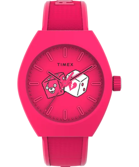 Embrace a unique fusion of style and functionality with the Timex® Analogue 'Urban Pop X Fortnite' Men's Watch TW2W96800. This stunning timepiece is designed for the modern man, characterized by its casual yet vibrant aesthetic that perfectly complements any outfit. With a striking pink ceramic case and matching dial, this watch stands out boldly. The round case with a diameter of 40mm and a thickness of 10mm offers an easily recognizable look, while its lightweight 40g frame ensures comfortable wear throughout the day. This timepiece features a reliable quartz movement, ensuring precise timekeeping for the man on the go. The mineral glass window protects the intricate dial, showcasing vibrant colors that speak to the playful spirit of Fortnite fans. The watch boasts a durable plastic band in a matching pink hue, measuring 21cm in length and 19mm in width. Designed with a secure buckle clasp, it guarantees that this stylish accessory stays comfortably in place during all of your daily activities. With a 5-bar water resistance rating, the Timex Urban Pop X Fortnite watch is ready for adventures in both urban and outdoor environments. Its attention to detail and playful design make it the perfect companion for men who appreciate both uniqueness and practicality. Elevate your watch collection with this eye-catching timepiece that doesn’t just tell time, but also tells a story.