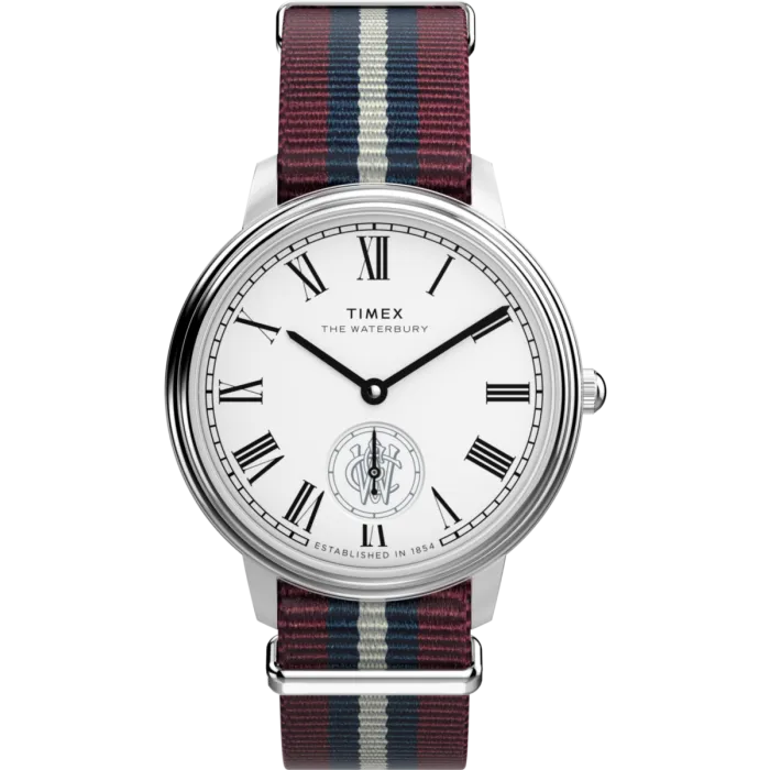 Timex® Analogue 'Waterbury Metropolitan' Men's Watch TW2Y27600 is a testament to Timex's legacy of crafting timeless pieces that blend function with style. Designed with the modern man in mind, this watch features a striking silver stainless steel case with a diameter of 39mm and a thickness of just 8.5mm, making it an ideal companion for both casual and formal occasions. The round case is not only sturdy, but also elegantly enhances the white dial that presents a classic analogue display, ensuring every glance at your wrist brings clarity and sophistication. The dial is protected by durable mineral glass, guarding against scratches while maintaining a polished look. This watch boasts a versatile multicolour fabric band, which measures 21cm in length and 18mm in width, providing a comfortable fit for all-day wear. The buckle clasp secures it reliably, ensuring that it stays in place as you navigate through your daily activities. Additionally, with a water resistance of up to 5 bars, you can confidently wear this watch during a range of environments, whether you're at the office or enjoying a weekend adventure. In terms of functionality, the quartz movement guarantees precise timekeeping, combining reliability with elegance. The Waterbury Metropolitan is not just a watch; it's a statement accessory that embodies a balance of professionalism and casual charm. This piece is perfect for men who value a refined aesthetic without sacrificing durability or comfort. Bring style and precision to your wrist with the Timex® Analogue 'Waterbury Metropolitan'.Shop Timex TW2Y27600 at Ormoda