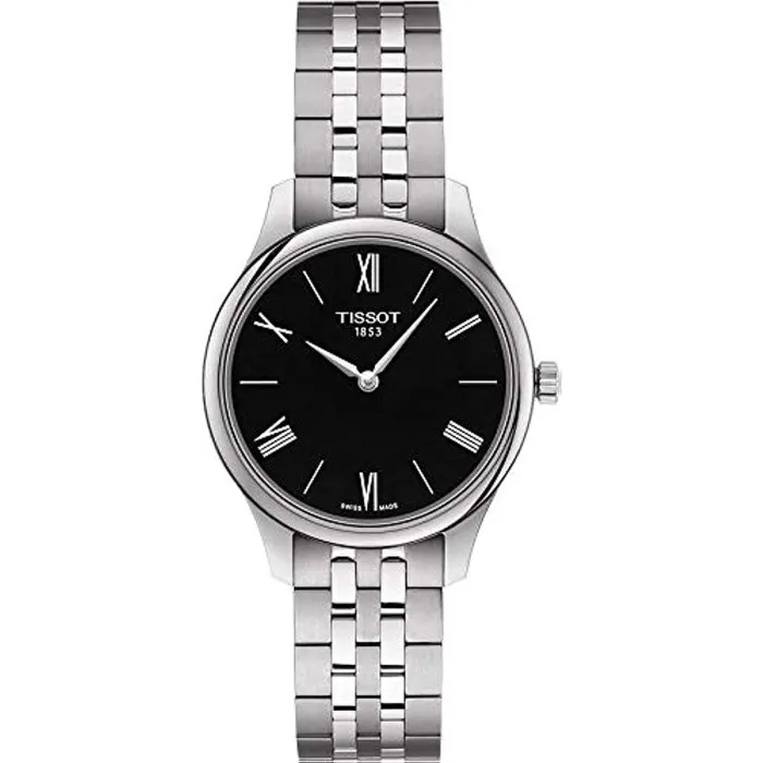 Tissot® Analogue '5.5 Lady' Women's Watch T0632091105800 is designed for the sophisticated woman who values both elegance and performance in her timepieces. This exquisite watch embodies the perfect blend of luxury and functionality, making it an ideal accessory for both formal gatherings and everyday wear. Crafted from high-quality stainless steel, the silver case not only enhances its durability but also exudes a refined charm. The round case, measuring 31mm in diameter and only 5.5mm thick, sits comfortably on the wrist, ensuring a sleek look without compromising on comfort. The stunning black dial is set beneath scratch-resistant sapphire glass, which ensures clarity and longevity. The analogue display provides an effortlessly classic aesthetic, while the deployment clasp offers a secure fit that is easy to manage. With a water resistance of up to 3 bars, this watch is designed for the modern woman who enjoys a balance of style and practicality. The band, also crafted from stainless steel, has a length of 19cm and a width of 14mm, providing versatility that matches a variety of outfits and occasions. Weighing just 66 grams, the Tissot® Analogue '5.5 Lady' is lightweight yet substantial enough to feel like a true companion. The expert craftsmanship of Tissot is reflected in every detail, making this watch not only a timekeeping device but also a piece of jewelry that elevates your style. Whether accessorizing for a gala or enjoying a casual outing, this watch adapts beautifully to your fashion needs, solidifying its place as a must-have in your collection.