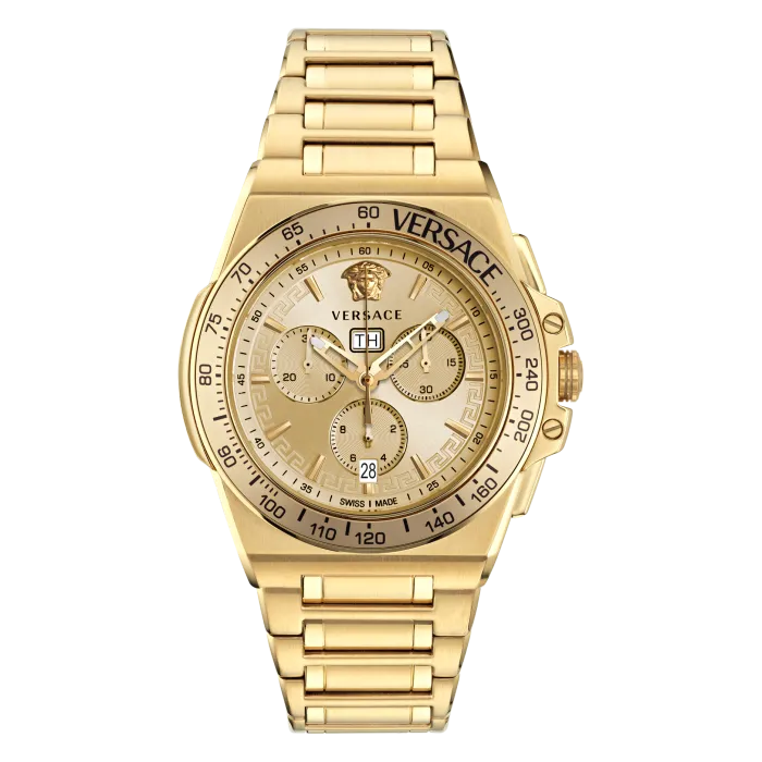 Introducing the Versace® Chronograph 'Greca Extreme' Men's Watch VE7H00723, a true embodiment of luxury and sophistication designed specifically for the modern man. This casual timepiece from the iconic Versace brand captures the spirit of Italian elegance infused with a contemporary edge. Founded in 1978 by the visionary Gianni Versace, the brand has long been synonymous with opulence and intricate artistry. The Greca Extreme model epitomizes these qualities with its striking design and remarkable craftsmanship, ensuring you wear not just a watch, but a statement piece that speaks to your style and personality. The watch showcases a radiant gold case that measures an impressive 45mm in diameter, made from high-quality stainless steel and built to endure the tests of time. The sleek 12mm thickness expertly houses the precision quartz movement, ensuring that each second is measured accurately while exuding an aura of refined luxury. Dominating the face of the timepiece is a stunning gold dial, protected by durable sapphire glass, enriched with a tachymeter bezel that enhances its sporty appeal. Equipped with a day-date function, the Greca Extreme ensures that you stay organized, making it perfect for both casual outings and important meetings. With a water resistance of up to 5 bars, this watch combines fashion with functionality, allowing it to accompany you through various environments without concern. The luxurious gold stainless steel band not only complements the case perfectly, but its deployment clasp provides security and comfort, guaranteeing a snug fit on your wrist while making it easy to wear. With a weight of just 170 grams and a comfortable band length of 21cm, this timepiece is not just visually stunning, but it also promises comfort and ease for everyday wear. The Versace® Chronograph 'Greca Extreme' Men's Watch is not merely a necessity, but an extension of your identity; a blend of elegance and functionality that reflects your exquisite taste in timepieces. Shop Versace VE7H00723 at Ormoda