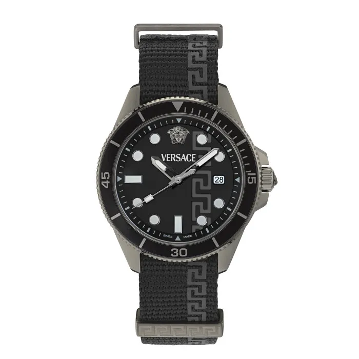 Versace® Analogue 'Greca Force' Men's Watch VE5J00226 embodies a bold fusion of style and functionality that resonates with modern masculinity. Crafted to perfection, this timepiece is a reflection of the dynamic Versace brand, known for its audacious designs and luxurious flair. With a powerful quartz movement, this watch ensures precision and reliability, making it an essential accessory for the contemporary man. The striking black dial with a sapphire glass window exudes a sense of sophistication, while the gun-colored stainless steel case, measuring 42mm in diameter and 10.3mm in thickness, presents a robust and assertive look. The watch bezel, adorned with numbers, adds a unique touch that enhances its functionality and aesthetic appeal. Featured is a multicolored nylon band that not only provides comfort but also introduces a playful twist to the watch's overall demeanor. With a band length of 21cm and width of 19mm, it is designed to fit securely on the wrist, secured by a classic buckle clasp. The watch also includes a calendar date function, ensuring you always stay organised in style. With a water resistance of up to 5 bars, the Greca Force watch is as resilient as it is stylish, ready to accompany you on any adventure. Light at just 80 grams, this watch is perfect for daily wear or special occasions, making it a versatile choice for any watch enthusiast. Embrace the essence of Versace with the Greca Force and elevate your wristwear game to new heights.Shop Versace VE5J00226 at Ormoda