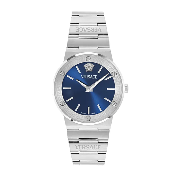 Experience the perfect blend of elegance and durability with the Versace® Analogue 'Greca Logo Aereo' Men's Watch VE5Q00326. This timepiece embodies the timeless legacy and sophisticated style that Versace is renowned for. Crafted from stainless steel, the round case in a striking silver finish complements the eye-catching blue dial. With a diameter of 38mm and a thickness of just 7.2mm, this watch strikes a balance between subtlety and presence, ensuring it remains comfortable to wear while making a statement. The watch features a reliable quartz movement, ensuring accuracy and minimal maintenance, perfect for the modern man on the go. The sapphire glass window protects the dial from scratches and enhances its clarity, so you can always trust the readout. Its lustrous silver watch band, measuring 22mm in width and extending to 21cm in length, adds an extra touch of sophistication. The deployment clasp ensures a secure fit, allowing for daily wear without worry. Built to withstand everyday challenges, it boasts a water resistance of up to 5 bars, making it suitable for splashes and brief underwater exposure. Whether dressing up for an important meeting or enjoying a casual outing, the Versace 'Greca Logo Aereo' watch provides the versatility to adapt to any occasion. Its blend of functionality and style makes it an essential accessory for every modern man's collection.Shop Versace VE5Q00326 at Ormoda