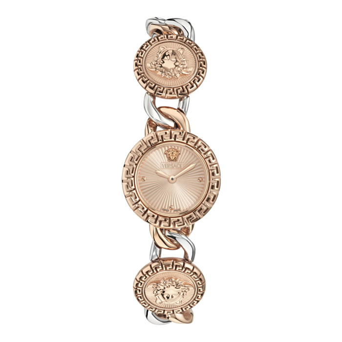 The Versace® Analogue 'La Greca Stud Icon' Women's Watch VE0Q00225 is a stunning embodiment of elegance and modern style. This exquisite timepiece features a round watch case crafted from durable stainless steel, boasting a radiant rose gold color that radiates sophistication and grace. With a diameter of 28mm and a thickness of 8mm, it is perfectly sized for the feminine wrist, creating a striking yet comfortable fit. The beautiful sunburst rose gold dial is protected by sapphire glass, ensuring both beauty and durability for everyday wear. The intricate design extends to the multicolored stainless steel band, measuring 19cm in length and 14mm in width. This watch features a folding clasp for easy wear, making it a practical addition to your jewelry collection. The captivating rose gold tones are complemented by Versace's iconic design flair, making this watch an essential accessory for any fashionable woman. Powered by precise quartz movement, the 'La Greca Stud Icon' ensures you stay punctual while making a bold statement. With a water resistance level of 3 bars, this watch is suitable for light splashes and everyday activities, adding to its versatility. The unique design elements, combined with high-quality materials, speak to Versace's commitment to style and craftsmanship, making this watch a delightful gift for oneself or a loved one.