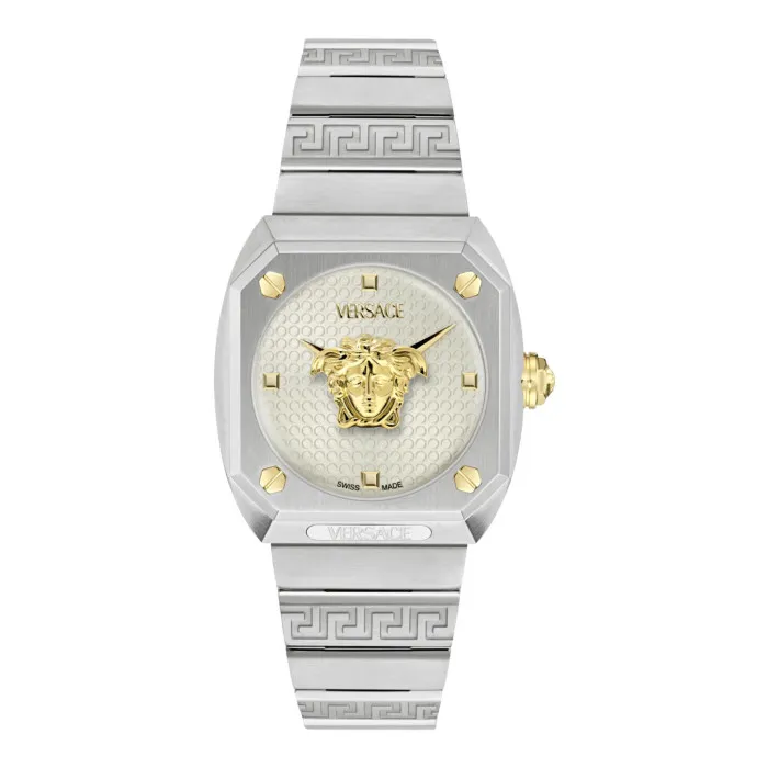 Introducing the Versace® Analogue 'Medusa Antares' Women's Watch VE0R00325, a stunning exemplification of elegance and sophistication tailored specifically for the modern woman. This exquisite timepiece not only serves a functional purpose but also creates a statement in any outfit. The Medusa Antares features a striking silver square case that gracefully couples with its soft beige dial, providing a perfect backdrop for the iconic Medusa emblem, which stands as a symbol of bold beauty and empowerment. Crafted meticulously, its stainless steel case offers an exceptional blend of durability and style, measuring 35mm in both diameter and length, adorned with a thickness of 11.4mm that adds to its refined profile. The watch movement is powered by a precision quartz mechanism, ensuring that every second is accounted for with accuracy and reliability. The sapphire glass window enhances not only visibility but also adds a layer of protection to withstand everyday challenges. The band is made of stainless steel, not just matching the case in color but also providing a seamless connection with a comfortable fit that spans 19cm in length. The deployment clasp guarantees security while allowing for easy wear. Water-resistant up to 5 bars, the Medusa Antares stands ready to accompany you through life’s adventures, from casual outings to elegant soirées. Its intricate design and thoughtful details create a perfect fusion of fashion and functionality, making it an ideal companion for any occasion. Whether you are dressing up for a special event or adding a touch of glamour to your everyday look, this watch epitomizes feminine strength and grace.Shop Versace VE0R00325 at Ormoda