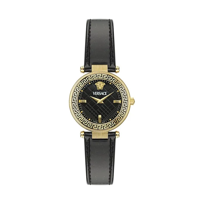 The Versace® Analogue 'Reve' Women's Watch VE8B00224 radiates elegance and sophistication suitable for any occasion. This exquisite dress watch is crafted with meticulous attention to detail, embodying the essence of Versace's luxurious style. Encased in a stunning gold stainless steel round case, it measures a perfect 35mm in diameter and 8mm in thickness, making it both eye-catching and comfortable for daily wear. The watch has a striking black dial, protected by a sapphire glass window, ensuring durability as well as a polished look. This sophisticated dial design compliments the overall aesthetic effortlessly, further enhanced by its delicate hour markers that add to its refined appearance. The strap of the watch is made from premium black leather, providing both style and comfort around the wrist, measuring 19cm in length and 17mm in width. The classic buckle clasp ensures a secure fit so you can wear it with confidence. With a water resistance of up to 5 bars, this timepiece can withstand splashes and brief immersion in water, making it practical as well as fashionable. Powered by quartz movement, this watch promises accurate timekeeping, while its lightweight of 48 grams adds to its wearability. Perfect for the modern woman, the Versace 'Reve' watch is an exceptional accessory that will elevate your wardrobe to new heights. Each glance at your wrist will be a reminder of the high-fashion world that Versace epitomizes, whether you're dressing up for a special event or enjoying a casual day out.