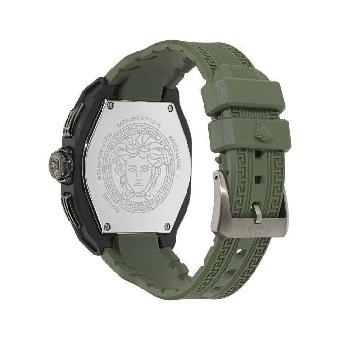 Step into the realm of sophistication with the Versace® Chronograph 'V Legend' Men's Watch VE9L00324. Crafted for the modern man, this exquisite timepiece features a striking black ceramic case that extends over a generous diameter of 44mm and a thickness of 13mm, making it remarkably durable yet undeniably stylish. The watch exudes an air of elegance with its sleek black dial protected by premium sapphire glass, which adds a touch of luxury while ensuring clarity and scratch resistance. Equipped with a precise quartz movement, it promises accuracy that effortlessly aligns with your professional lifestyle. The band, made of high-quality green plastic, enhances the watch's design and provides a comfortable fit with a length of 21cm and a width of 20mm. Its robust buckle clasp ensures that this remarkable piece stays secure on your wrist. For those who appreciate functionality, the chronograph display offers additional features such as a stopwatch and luminous hands, allowing you to keep track of time even in low-light conditions. With a water-resistant capacity of up to 5 bars, the watch adapts effortlessly to various environments, making it a perfect ally for both business meetings and outdoor adventures. Versace embodies a legacy of iconic elegance and artistry, and the V Legend is no exception. By combining luxury with practical functionality, this watch is designed for the man who values both aesthetics and performance. Its Swiss-made craftsmanship underscores a commitment to quality that reflects Versace's prestigious heritage, providing you with a timepiece that is not only a statement but also a reliable companion in all your endeavors.Shop Versace VE9L00324 at Ormoda