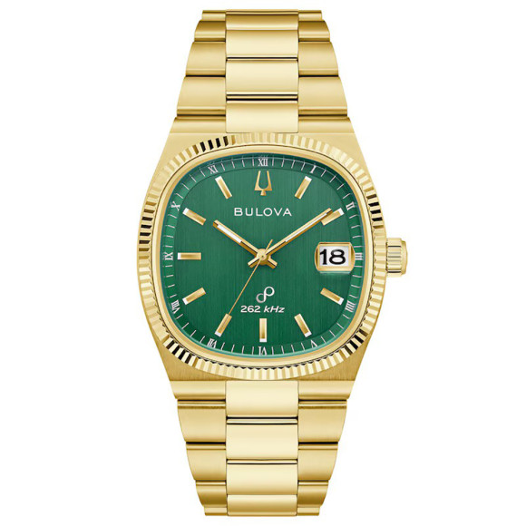 Meet the Bulova® Analogue 'Super Seville' Men's Watch 97B237, a statement piece designed for the discerning gentleman. This exquisite watch harmonizes classic elegance with modern functionality, making it a perfect accessory for both business meetings and casual outings. Crafted with precision, this timepiece serves not just as a tool for telling time but as a piece of art that adorns the wrist of a man who appreciates sophistication and style. The brand's rich heritage in watchmaking ensures each piece is engineered for excellence, combining high-quality materials with innovative design. Bulova is renowned for its commitment to creating durable watches that can withstand the test of time, making it a trusted choice for those who value both aesthetics and longevity. The watch features a striking gold-toned stainless steel case that is not just visually stunning but also robust, ensuring longevity against wear. Its 37mm round case diameter and 10mm thickness make it comfortable and perfectly sized for any gentleman's wrist. The gorgeous green dial pops against the gold casing and offers a perfect blend of style and readability, equipped with sapphire glass to resist scratches and withstand daily challenges. The watch features a date calendar, providing practicality along with its stylish look. Complementing the case is a matching gold stainless steel band, measuring 21cm in length and 25mm in width. The deployment clasp secures the watch comfortably on your wrist, adding to its luxurious feel. With a water resistance of up to 3 bars, the Bulova 'Super Seville' is built to adapt to various environments, whether you're at a business meeting or enjoying a weekend adventure. Weighing in at a modest 142g, this watch is light yet substantial enough to feel like a part of you. Its masculine design and expert craftsmanship make it an ideal choice for any man looking to make a lasting impression.Shop Bulova 97B237 at Ormoda
